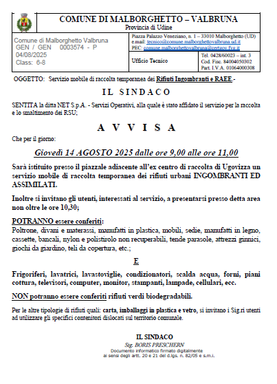 Presso il piazzale adiacente al centro di raccolta di Ugovizza viene istituito saltuariamente il servizio mobile di raccolta temporanea dei rifiuti INGOMBRANTI ed ASSIMILATI.
